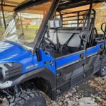 Highlights include: Selectable 2WD/4WD, shaft. Dual mode rear differential with differential lock, radial tires, continuously variable transmission, dual disc brakes, 10.2″ ground clearance, hardtop with windshield, doors, easy conversion from one row to two, large cargo bed, load capacity of 1600 lbs, 2000 lb towing capacity, Multi-function display includes digital speedometer, fuel gauge, odometer, hour meter, clock, dual trip meters, 2WD/4WD indicator, water temperature warning indicator, oil pressure warning indicator, fuel injection warning indicator, CVT and EPS warning indicators, neutral, reverse and parking indicators, seatbelt reminder lamps.